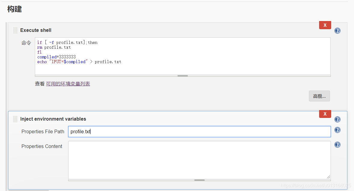 我们在构建中增加步骤"Inject environment variables", 将写在配置文件中的变量${IFUT},注入到环境变量里。